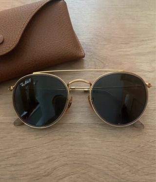 Gafas de sol Ray-Ban con montura dorada y lentes negras. - Diseño redondo. - Incluye funda protectora.