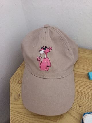 Vendo gorra de béisbol con diseño de la Pantera Rosa. Es de color beige y tiene un estampado rosa. - Gorra estilo clásico. - Estampado de la Pantera Rosa con gafas de sol y una bebida. - Diseño único y divertido.