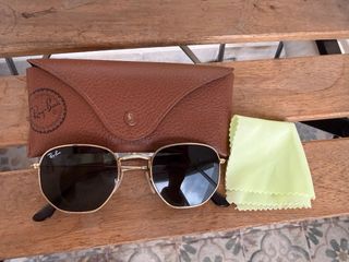Gafas de sol Ray-Ban con un diseño octogonal y montura dorada. - Incluye funda de cuero marrón. - Paño de limpieza incluido. Ligero puntito en uno de los cristales que no se aprecia ni afecta en nada en la visión. Gafas originales.