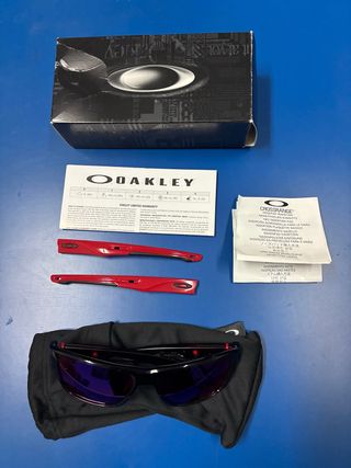 Gafas de sol Oakley Crossrange con lentes moradas y detalles en rojo. - Montura negra. - Incluye dos varillas de repuesto en color rojo. - Bolsa protectora de tela negra. - Recambio goma nasal