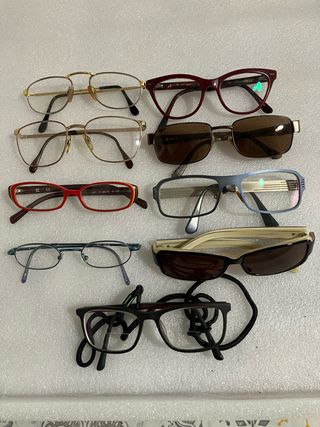 Lote de monturas de gafas de diferentes estilos. - Montura dorada con diseño clásico. - Montura de pasta burdeos. - Montura metálica con lentes marrones. - Montura roja. - Montura azul metálica. - Montura de pasta beige y negra con lentes oscuras. - Montura negra con cordón.