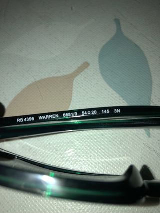 Estas gafas se caracterizan por: Marca: Ray-Ban Modelo: Warren Bio-Based RB4396 Código de color: 6681/3 Color de la montura: Verde transparente Color de las lentes: Marrón Material: Acetato de base biológica, lo que indica un compromiso con la sostenibilidad Las medidas específicas indicadas en la patilla son: Calibre (ancho de la lente): 54 mm Puente (ancho del puente): 20 mm Longitud de la varilla: 145 mm