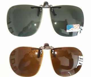 Dos suplementos de pinza para protección solar de gafas graduadas, colores gris verdoso y marrón. Son polarizadas y la pinza es abatible lo que permite que se pueda elevar con un simple movimiento sin tener que despinzar. Medidas en fotos. Made in USA.