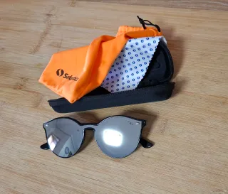 Gafas de sol con lentes de espejo y montura. - Lentes con acabado espejo. - Montura de color negro. - Incluye funda protectora. - De Soloptical. Tiene una pequeña rozadura en la derecha junto al puente (ver foto)
