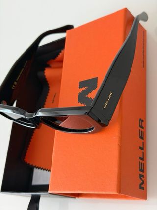 Gafas de sol Meller con un diseño moderno y elegante. - Montura de color negro. - Lentes con tonalidad oscura. - Incluye funda naranja.