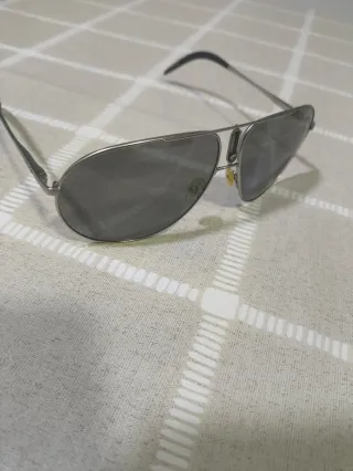 Gafas de sol estilo aviador de la marca Carrera. - Montura metálica plateada. - Lentes de color gris. - Diseño clásico y atemporal. Tiene una rayita muy pequeña en una lente pero que no se ve al ponertelas. No incluye estuche,pero si una funda no original.Negociable el precio,no cambios.