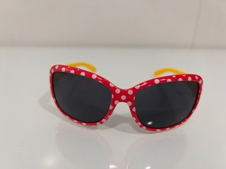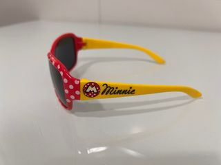 Divertidas gafas de sol con el diseño de Minnie Mouse. - Montura roja con lunares blancos. - Varillas amarillas.