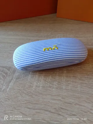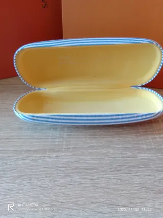 Funda rígida para gafas con un diseño de rayas azules y blancas. Es un accesorio práctico para proteger tus gafas.precio negociable - Cierre seguro. - Interior suave para evitar arañazos. - Diseño a rayas.