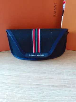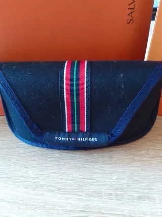 Funda para gafas de sol de la marca Tommy Hilfiger. Presenta un diseño con detalles de cintas en colores rojo, blanco y verde.precio negociable - Cierre de solapa. - Ribete azul.