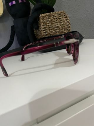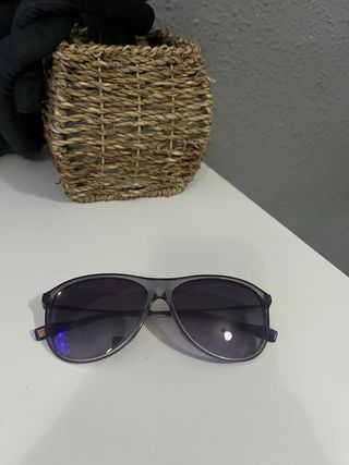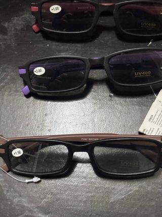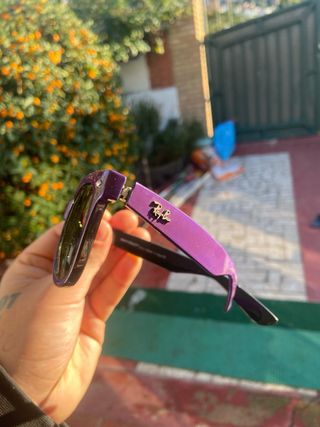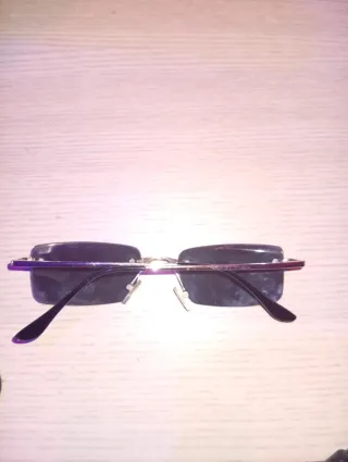 Gafas de sol con graduación para presbicia. - Montura negra y detalles morados. - Lentes con protección UV400. - Distintas graduaciones y colores - Se entregan con funda. - Las gafas están sin usar las fundas están algo deterioradas