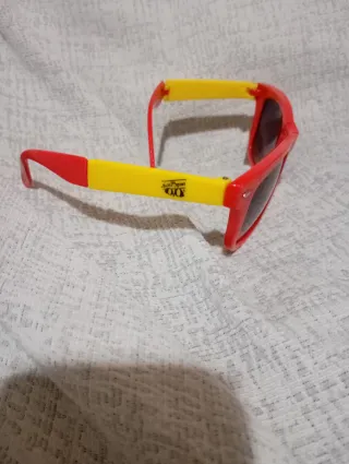 Gafas de sol con un diseño llamativo y moderno. - Montura de color rojo vibrante. - Varillas con detalles en amarillo. - Lentes oscuras para protección.