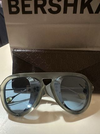 Gafas de sol de estilo aviador oversize de la marca Gucci. - Montura en tono grisáceo. - Lentes de color azul. - Diseño llamativo y moderno.