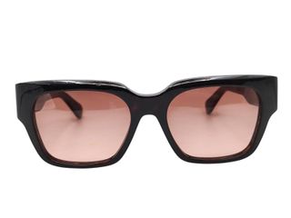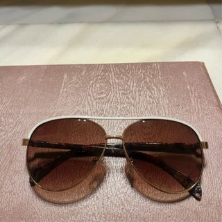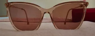 Elegantes gafas de sol con un diseño moderno y sofisticado. - Montura de acetato en tono rosa pálido. - Lentes con tinte marrón degradado. - Patillas finas metálicas. Usadas una sola vez.