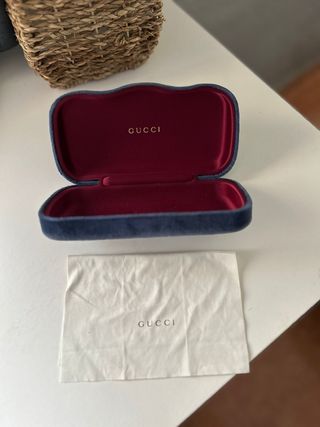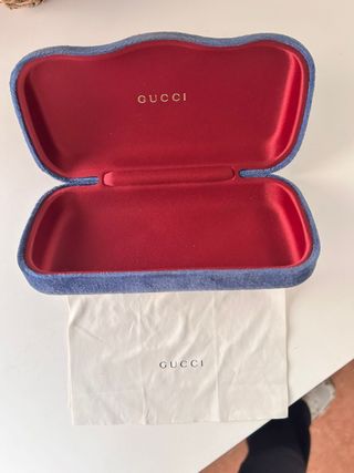 Estuche para gafas de la marca Gucci. Su interior es de color rojo y el exterior de terciopelo azul. - Incluye funda de tela para proteger las gafas.