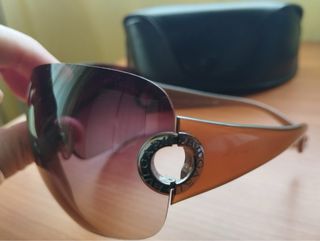 Elegantes gafas de sol Bvlgari con un diseño moderno. Montura con detalles en marrón y lentes degradadas a morado.