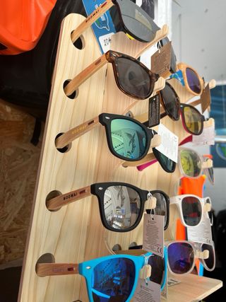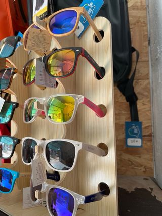 Gafas de sol en varios colores - Montura de plástico resistente y patillas de madera - Lentes con protección UV400.