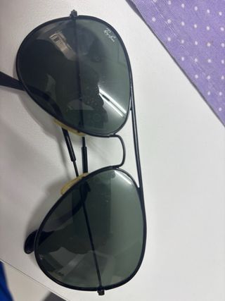 Gafas de sol estilo aviador de la marca Ray-Ban. - Montura metálica negra. - Lentes oscuras. - Diseño clásico.