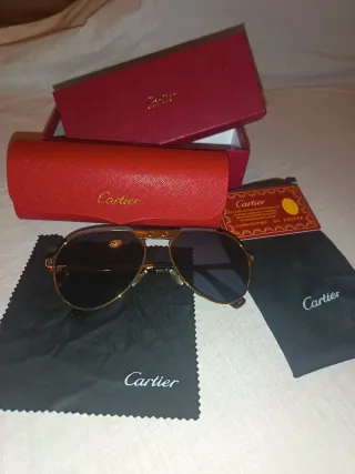 Elegantes gafas de sol Cartier, con un diseño plegable y detalles en oro y negro. Incluyen su estuche original y funda protectora. - Montura metálica dorada. - Lentes oscuras. - Diseño plegable para fácil transporte. - Incluye estuche rígido y funda de tela. Contactar antes de comprar