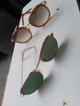 Gafas de sol estilo aviador con un toque retro. - Montura dorada. - Lentes verdes. Usadas pero en buen estado, allí su precio.
