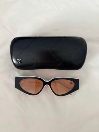 Elegantes gafas de sol Chanel con un diseño llamativo. - Montura combinada en negro y blanco. - Forma de ojo de gato. - Lentes con tinte marrón. - CHANEL CH6056 1656/53 54 - No son originales - Lentes de buena calidad