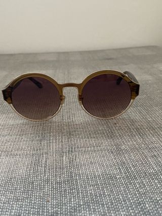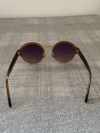 Elegantes gafas de sol con montura dorada, son un combinado de pasta y metal, la pasta de marrón semitransparente y el metal dorado. Son nuevas, no tienen funda. - Diseño redondo. - Lentes con degradado.