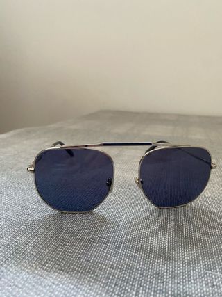 Gafas de sol con montura plateada y lentes con reflejos azules y rosados. (Sin su caja, solo las gafas) - Montura metálica. - Diseño moderno.