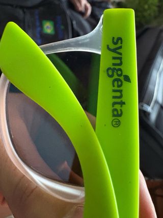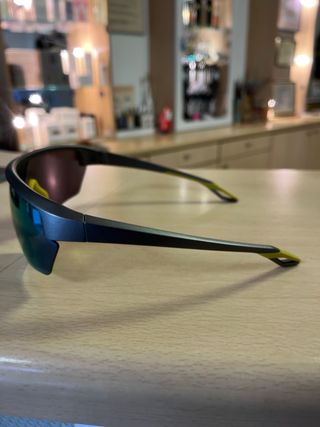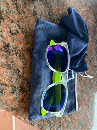 Gafas de sol Syngenta con un diseño moderno. - Montura translúcida. - Lentes con reflejos azules y morados. - Detalle en color verde lima en las patillas.