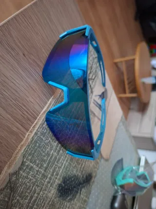 Gafas de sol de estilo deportivo con un diseño moderno y llamativo. - Montura de color azul. - Lentes con acabado espejo en tonos azules y morados.