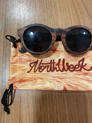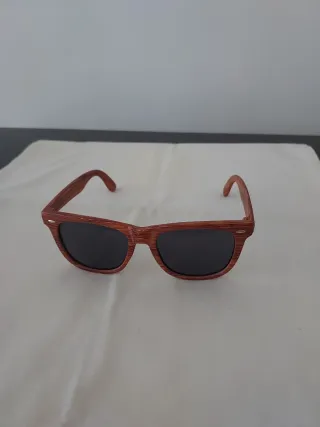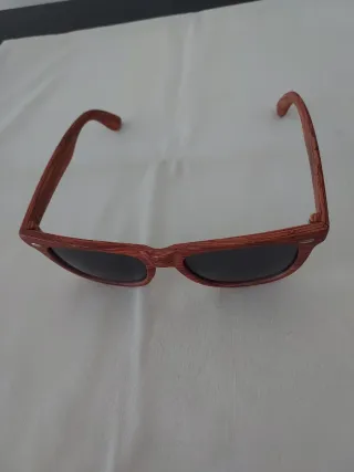 Gafas de sol con montura de madera. Montura de madera con acabado veteado. Marca Bacardi. Hechas de madera de barriles de roble reciclados. Lentes oscuras. Están en perfectas condiciones.