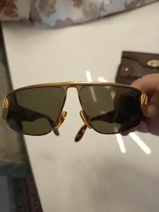 Gafas de sol de la marca VonFustemberg con un diseño llamativo. Con su funda original en piel - Montura metálica dorada. - Lentes con efecto tortuga y tinte verde. - Detalles dorados en las patillas.