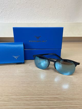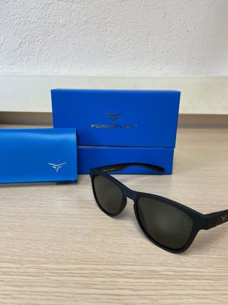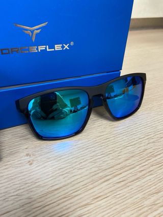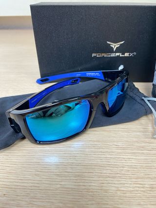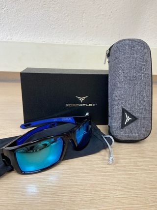 Gafas de sol de la marca Forceflex con un diseño moderno y flexible. Tiene una marca en el puente (última foto) - Montura de color negro. - Lentes de color azul. - Incluye estuche y caja de la marca.