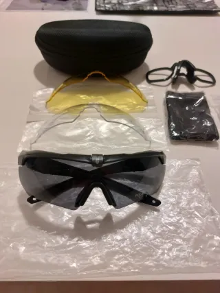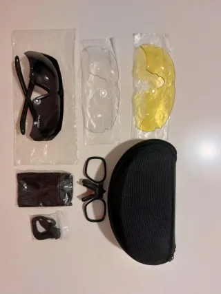 Kit de gafas tácticas militares con lentes intercambiables y accesorios. - Lente principal oscura polarizada. - Lente amarilla. - Lente transparente. - Montura negra. - Montura para dioptrias. - Incluye funda rígida, gamuza y cinta para las patillas. - Certificación CE Z87 #airsoft #tiro #balistica #senderismo #ciclismo #btt #mtb