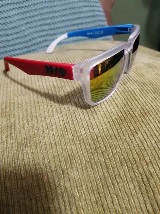 Gafas de sol de la marca Spy con un diseño moderno y llamativo. - Montura transparente. - Lentes espejadas multicolor. - Detalle de patillas en rojo y azul.