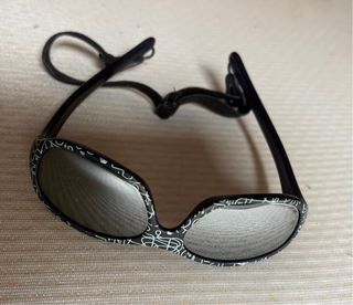 Gafas de sol para niños con un diseño llamativo. - Montura negra con detalles en azul. - Lentes con protección. - Con correa de protección anti caídas
