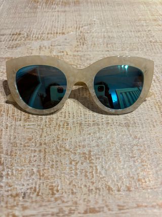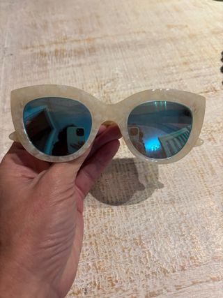Gafas de sol con un diseño moderno y lentes de espejo azules. - Montura de color beige con un patrón marmoleado. - Lentes con acabado espejo en tono azul. - Estilo cat-eye.