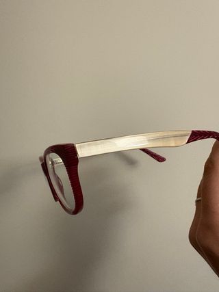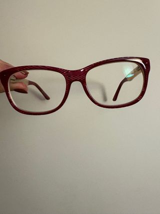 Gafas de vista con un llamativo diseño en color rojo. - Montura con patrón de líneas finas. - Diseño moderno y elegante.