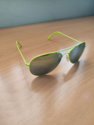 Gafas de sol estilo aviador, con montura verde lima y lentes plateadas. Están en buen estado. - Montura metálica. - Lentes reflectantes.