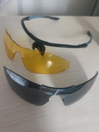 Conjunto de cristales de repuesto para gafas de sol Kalenji. - Un cristal de color negro - Un cristal de color naranja Adjunto foto de la montura para facilitar la compatibilidad de los cristales, pero ésta no se vende. Cualquier duda, contacta!
