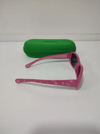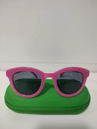 Gafas de sol infantiles con montura rosa. De 13 cm de largo horizontal. Son de óptica. Incluyen funda protectora verde y paño. La entrega tiene que ser en Parla (Madrid).
