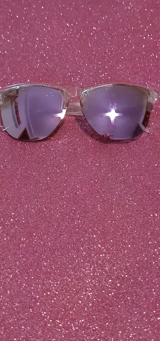 Gafas de sol con montura morada tirando a rosa translúcida y lentes con acabado grisáceo. - Montura de plástico. - Lentes con tinte gris. - Diseño moderno y llamativo y de excelente calidad. - Están sin estrenar.