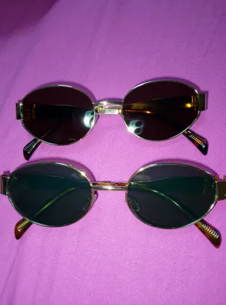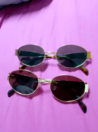 Lote de dos gafas de sol con montura dorada. Las lentes son de cristal, no es plástico. Las patillas tienen un bonito estampado animal print y la lente de cada una es distinta, una es más oscura que la otra. Sin estrenar ambas. - Diseño ovalado. - Montura metálica dorada.