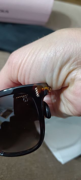 Gafas de sol con un diseño clásico y moderno. Una pequeña marca en el cristal izquierdo. El resto perfecto. - Montura superior negra. - Detalles metálicos dorados. - Lentes oscuras.