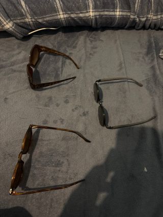 Conjunto de tres pares de gafas de sol con monturas de diferentes estilos. - Gafas de sol con montura grande y lentes marrones. - Gafas de sol redondas con montura metálica fina. - Gafas de sol estilo wayfarer con montura de carey.