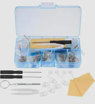 Kit completo para el mantenimiento y reparación de gafas. Incluye una variedad de tornillos y herramientas esenciales. - Estuche organizador con compartimentos. - Variedad de tornillos para gafas. - Pinzas de precisión. - Destornilladores pequeños. - Paño de limpieza.
