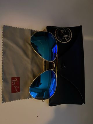Funda + gafas de sol RB. - Modelo aviador - Color dorado cristal azul efecto espejo. - Cierre a presión. - Logo de RB y Luxottica.