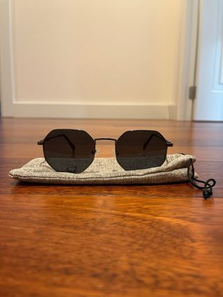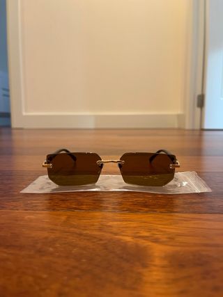 Gafas de sol con un diseño moderno y elegante. - Montura dorada. - Lentes marrones. - Forma octogonal sin marco. Precio negociable