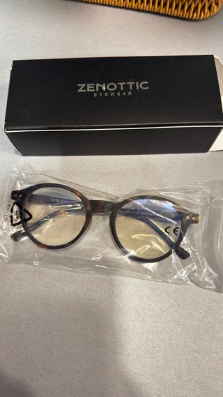 Gafas de la marca Zenottic con protección contra la luz azul. - Montura de diseño redondo. - Combinación de colores negro y marrón.