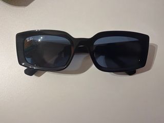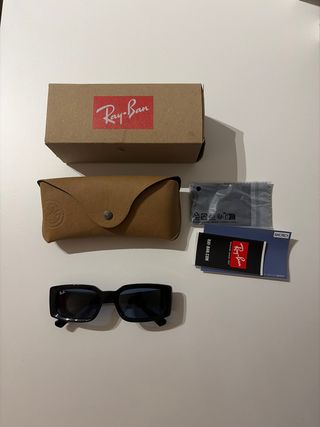 Gafas de sol Ray-Ban con montura negra y lentes azules. Incluyen caja y funda. - Montura de acetato. - Lentes con protección UV. - Diseño rectangular.