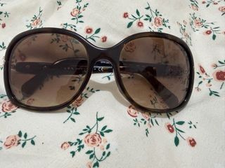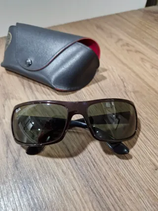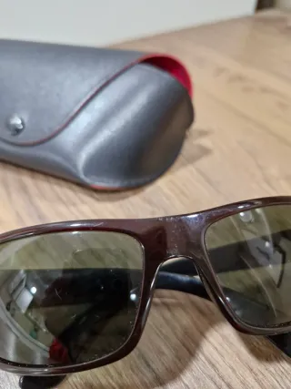 Gafas de sol Ray-Ban con montura marrón oscuro y lentes tintadas. - Incluye estuche protector. - Están algo rayadas en la montura. - Están gastadas en la patilla, por lo que no se puede ver el modelo.