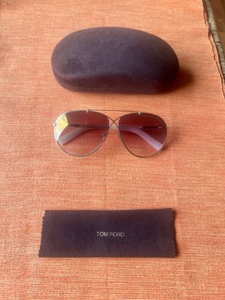 Gafas de sol Tom Ford con un diseño de aviador. - Montura metálica plateada. - Cristales degradados en tonos marrones. - Incluye funda rígida y paño de limpieza.